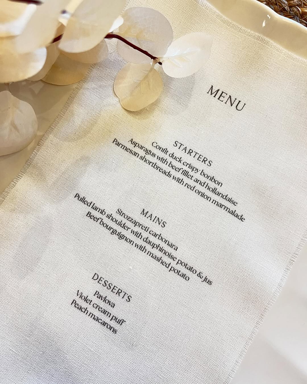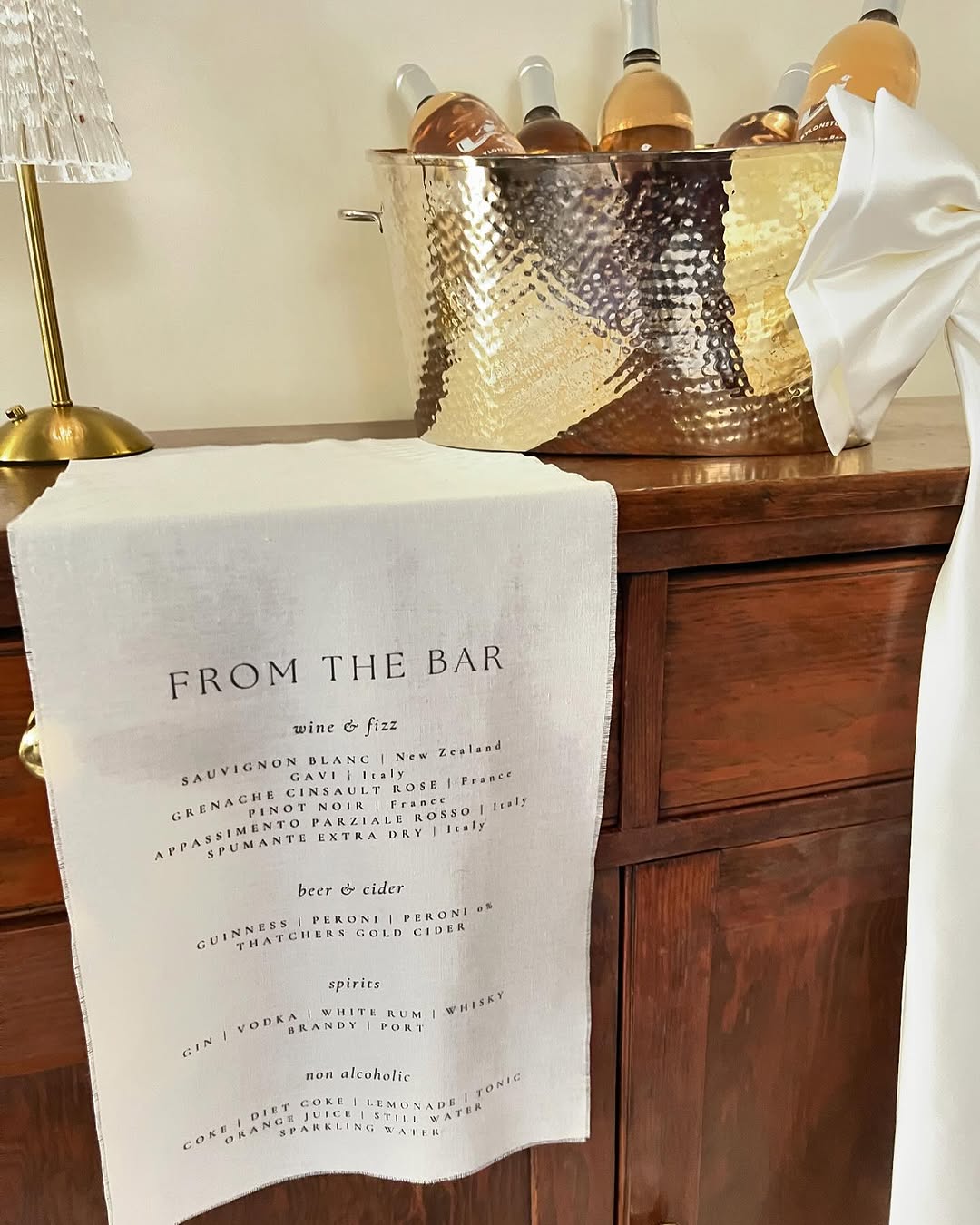 A beautifully printed fabric bar menu, adding a touch of sophistication to your wedding reception.
